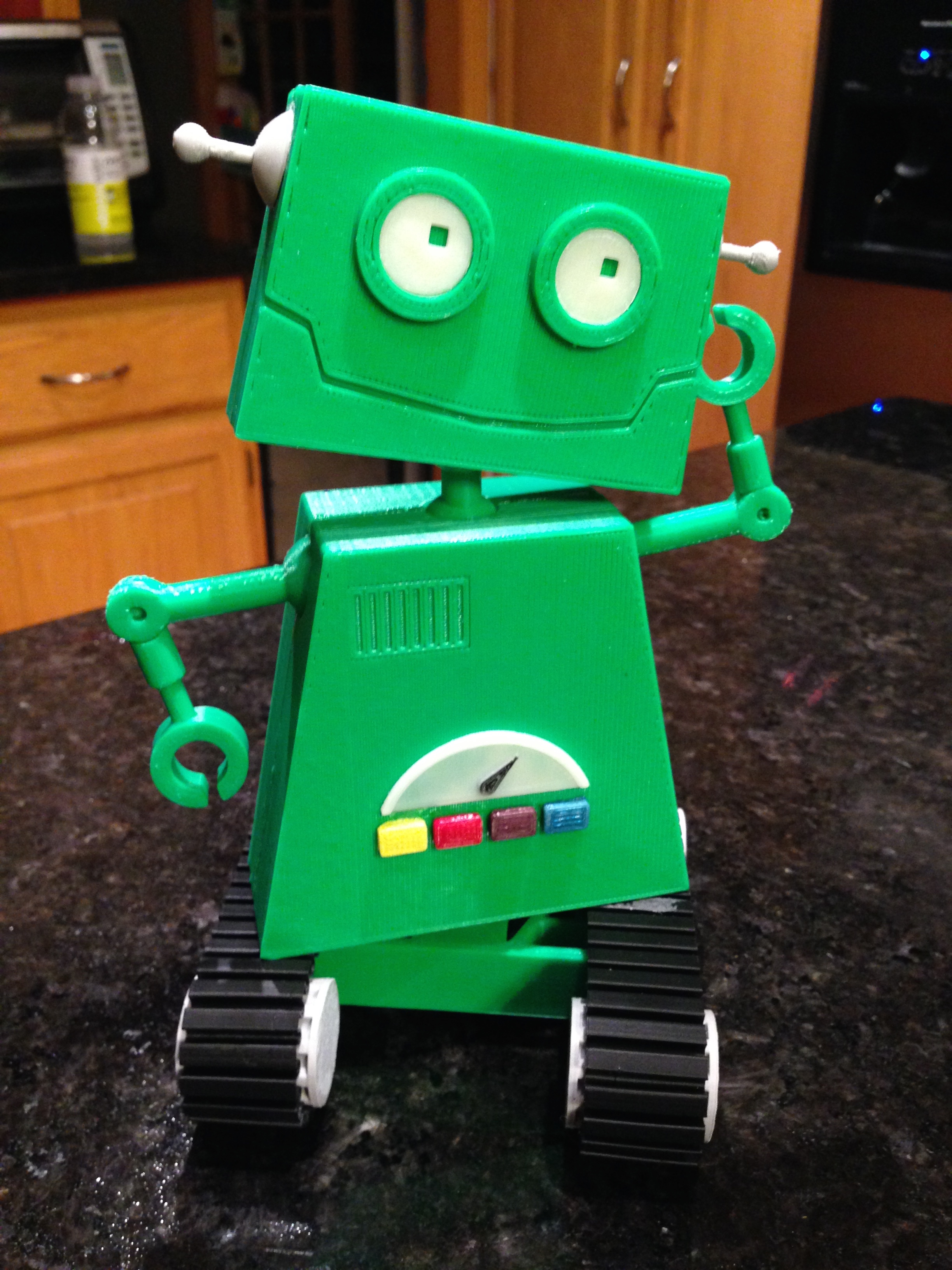 It was difficult to get exactly the right fit between the joint pieces so that they’d be loose enough that the arms and neck could move but would still stay in place from the pressure between the front and back of the robot alone. When the print finished, the joint was a little bit loose, so I added coats of clear nail polish to the inner joints until it was just the right tightness.