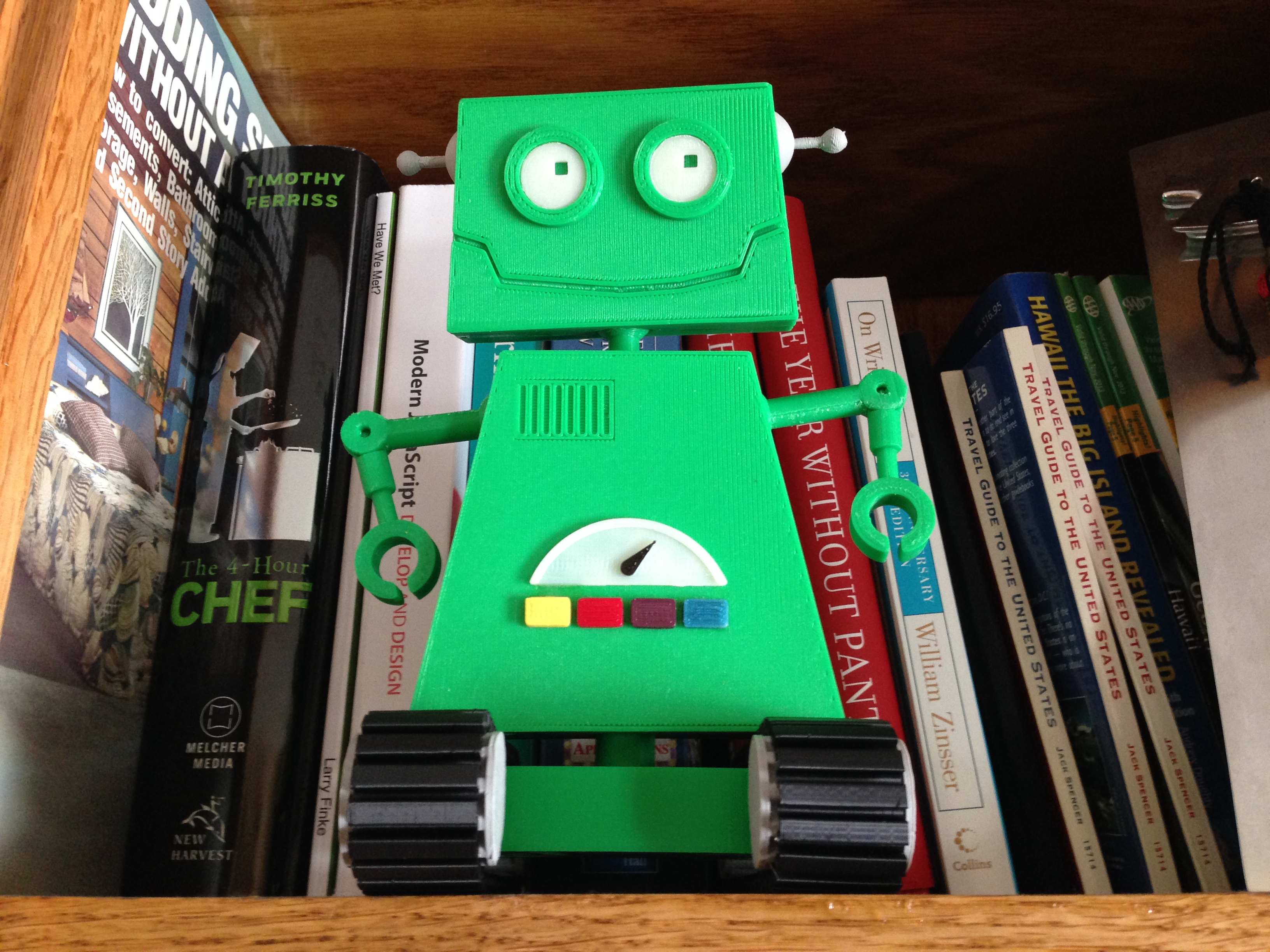I designed the entire thing in OpenSCAD, and I’ve published all of the source files on GitHub, so you can print your very own Akisbot. The bot in these pictures was printed at 40% scale and is eight inches tall.