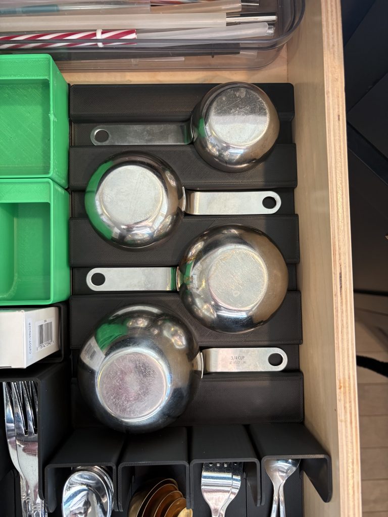 Our silverware drawer has been in flux since I remodeled our kitchen in 2023, and Gridfinity gave me a perfect path to a solution. After a late night with OpenSCAD and some digital calipers, our measuring cups will no longer loll around next to the forks and spoons like metal tumbleweeds.